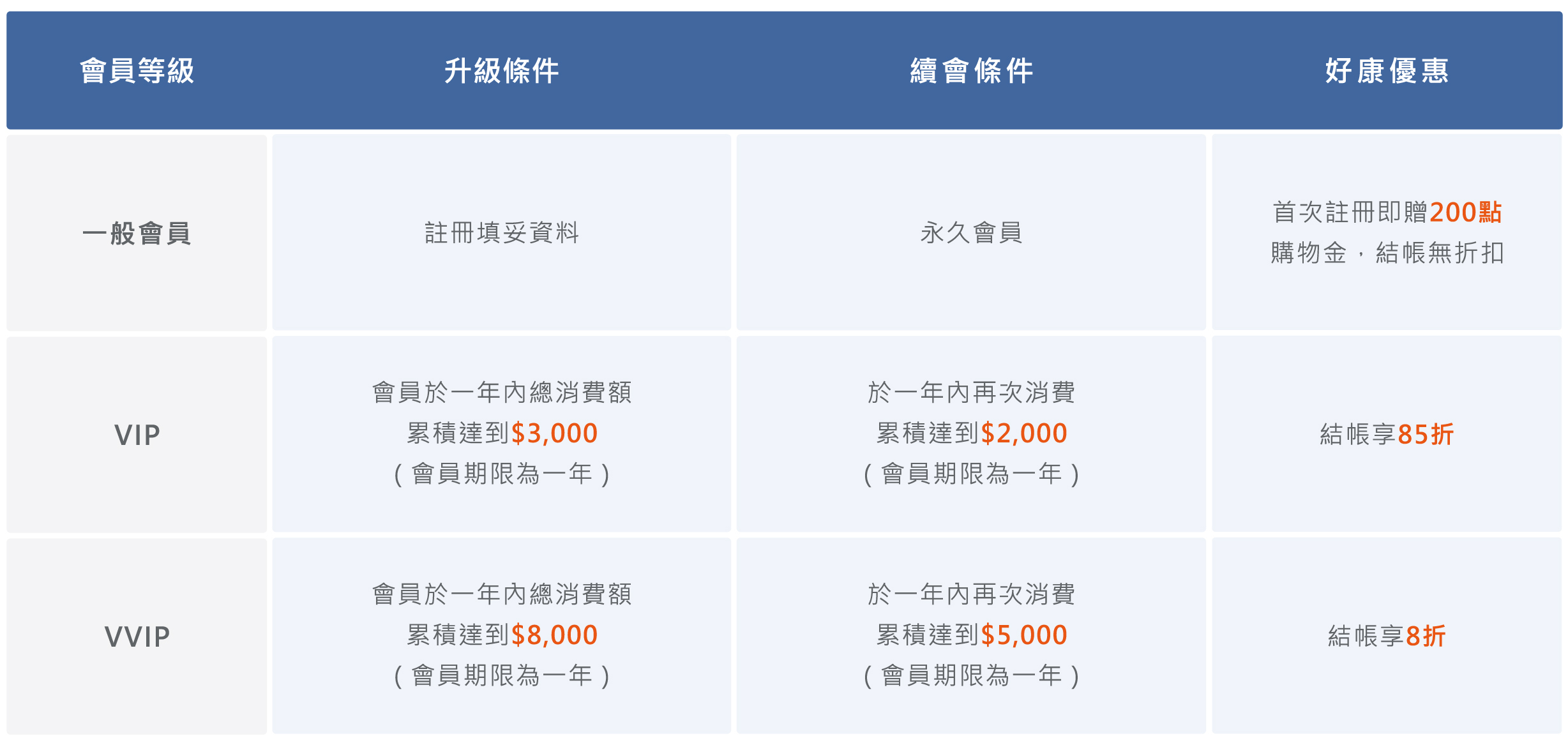 VVIP會員:於當日起一年內消費累積達$5000,即可再享一年之VVIP優惠。