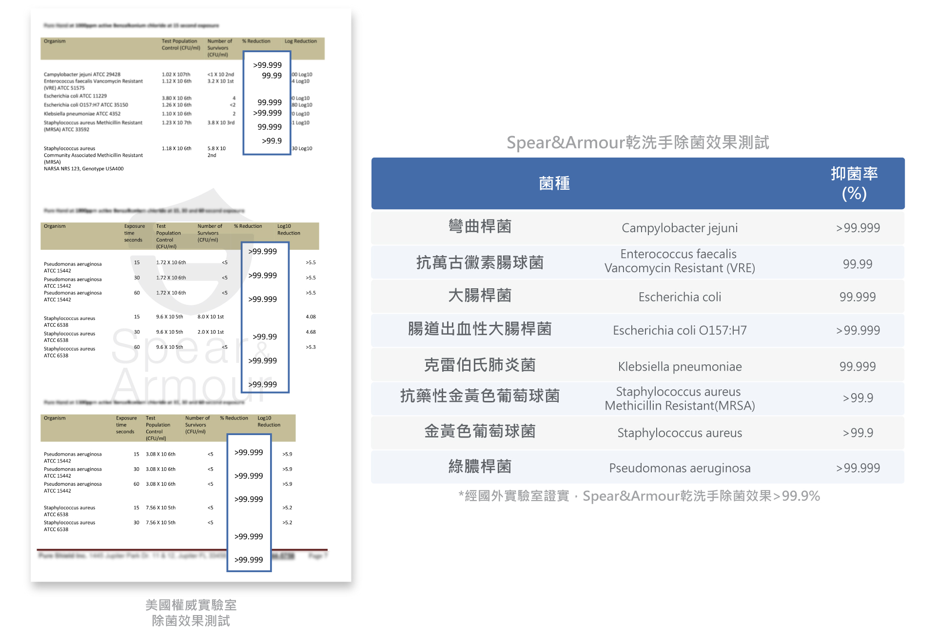 “ Spear & Armour 思必兒乾洗手系列除菌效果>99.9% ”