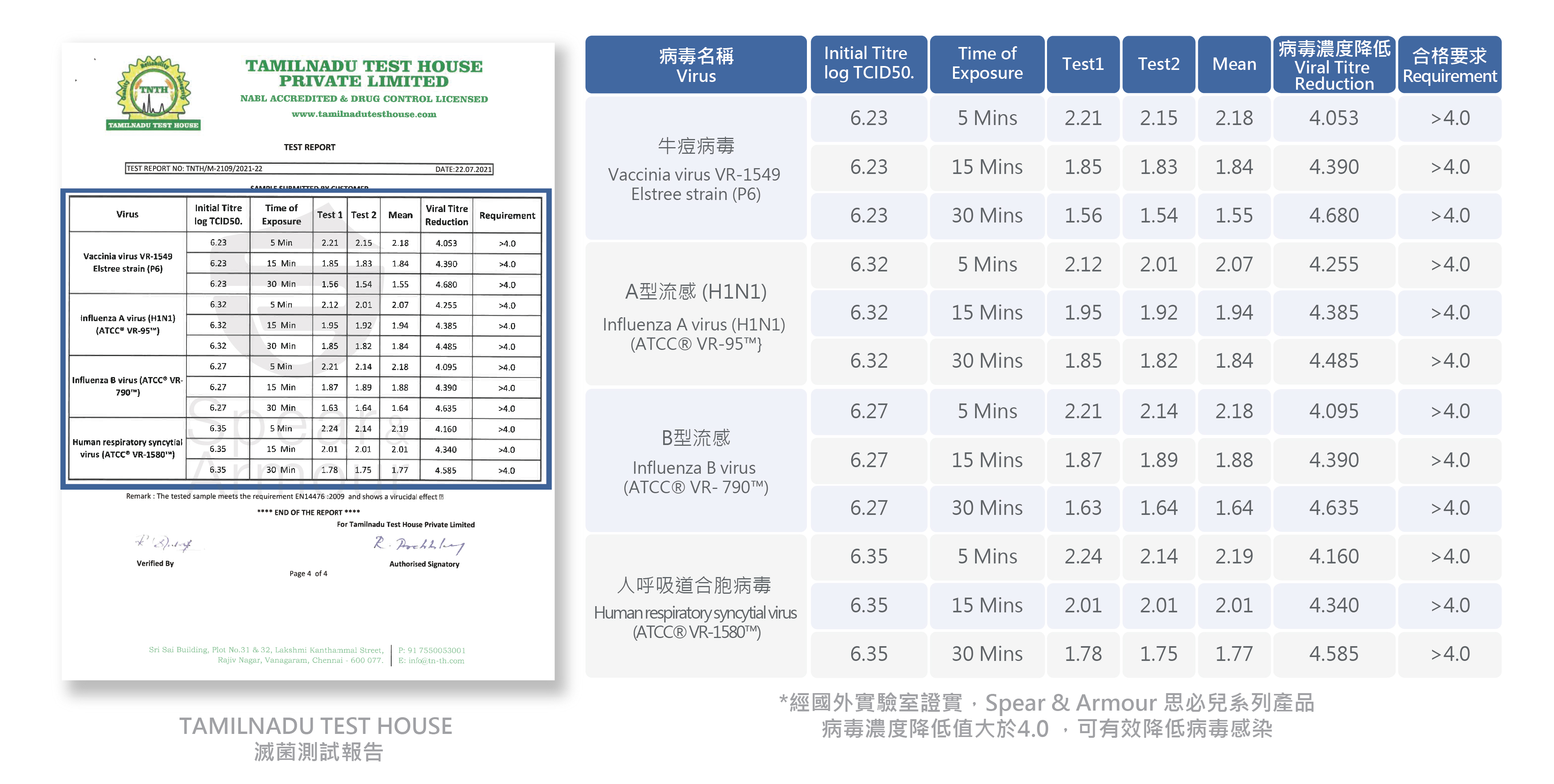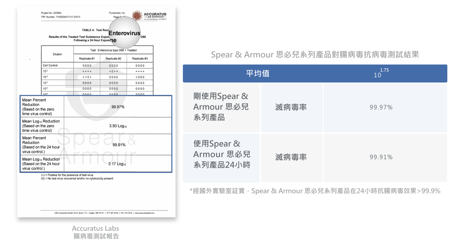 “ Spear & Armour 思必兒系列產品24小時 腸病毒效果>99.9% ”
