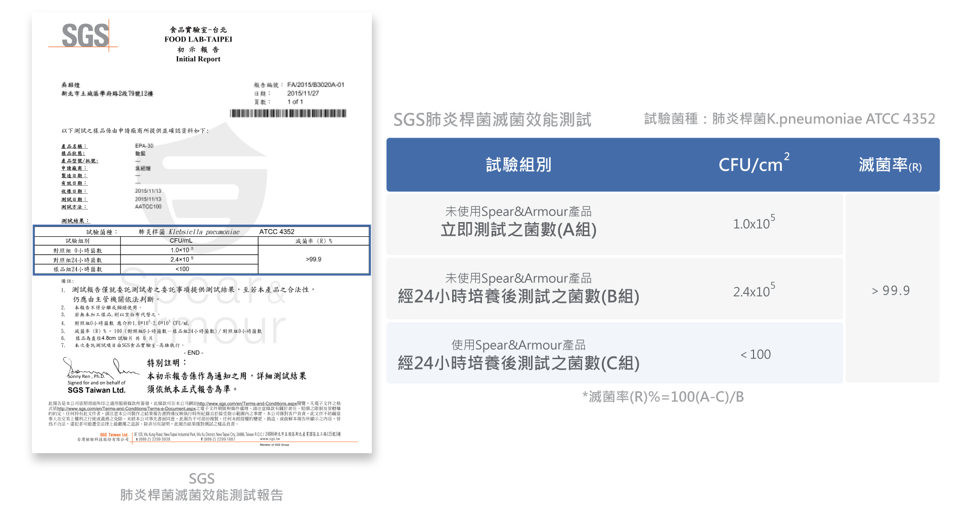 “ Spear & Armour 思必兒系列產品對肺炎桿菌滅菌率 >99.9% ”