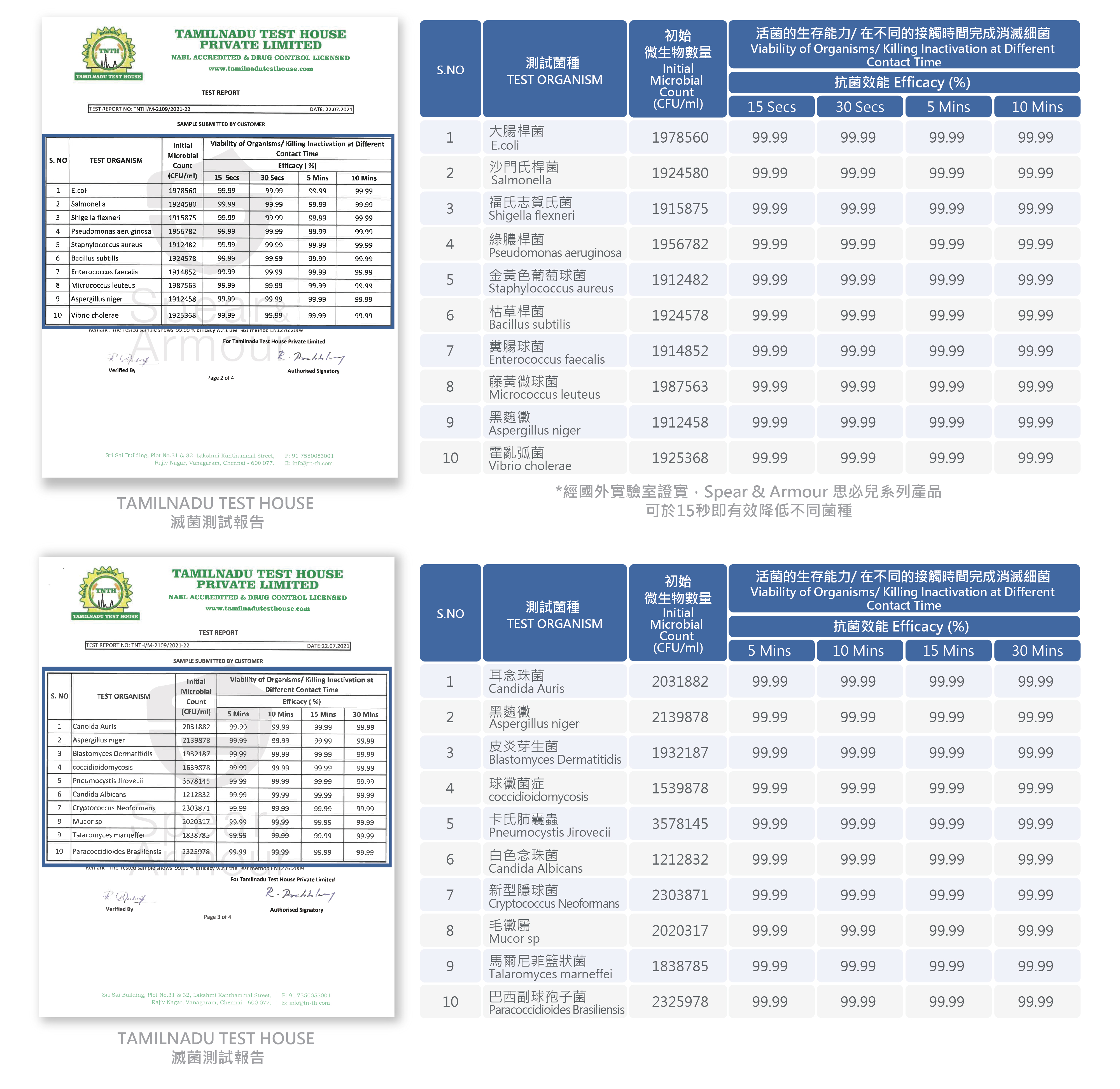“ Spear & Armour 思必兒系列產品針對不同菌種抗菌效能測試 ”