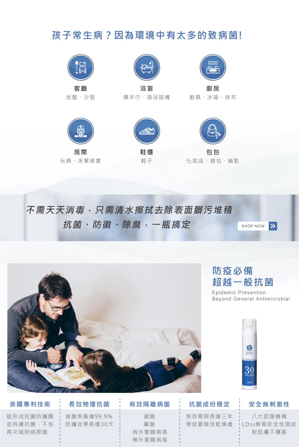 • 形成30天長效抗菌防護層,有效隔離多種病原菌