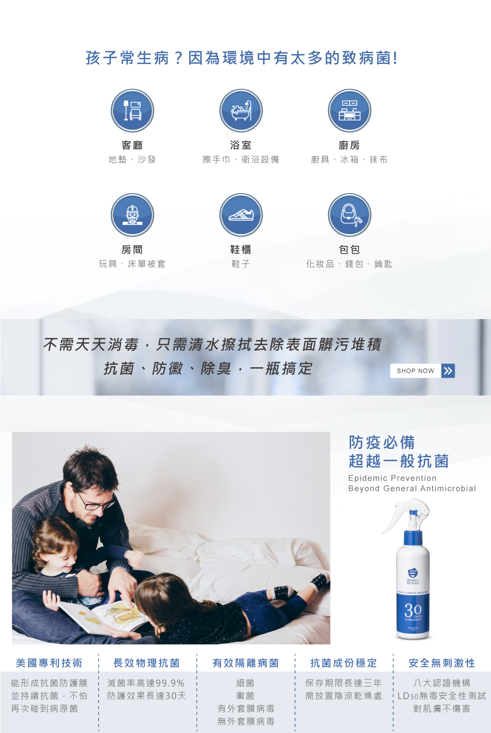• 形成30天長效抗菌防護層,有效隔離多種病原菌