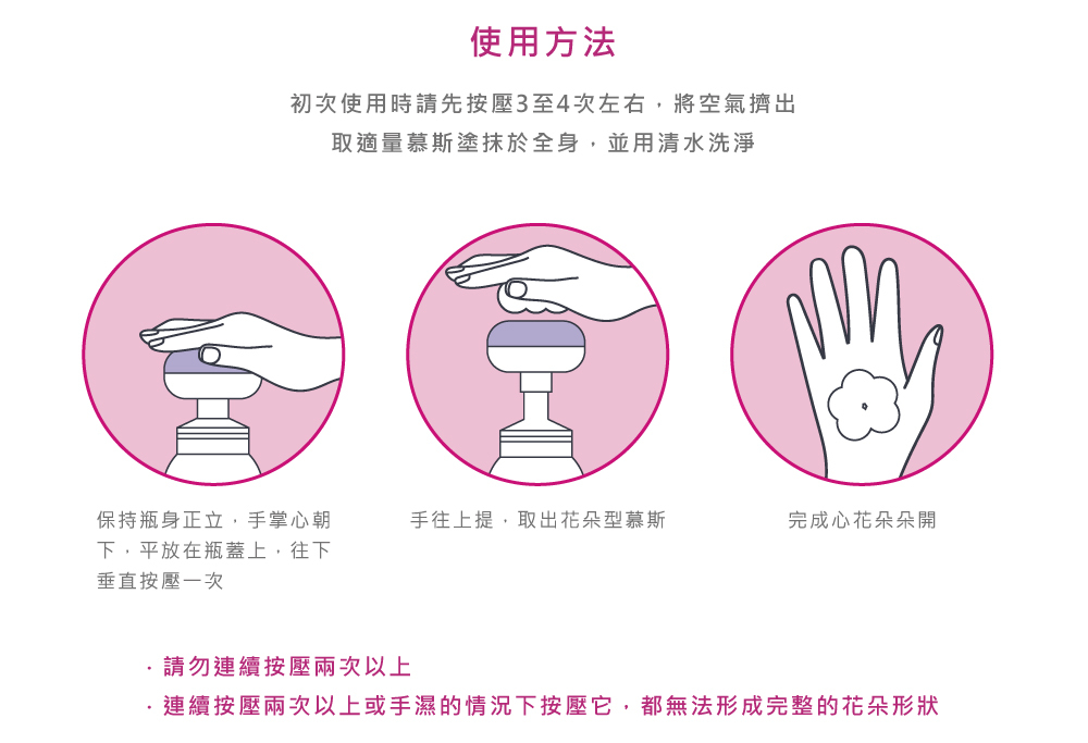 《 使用方法 》用溫水弄濕寶寶頭髮及身體,保持瓶身正立,手掌心朝下,平放在瓶蓋上,往下垂直按壓一次,並按壓出適量慕斯,均勻