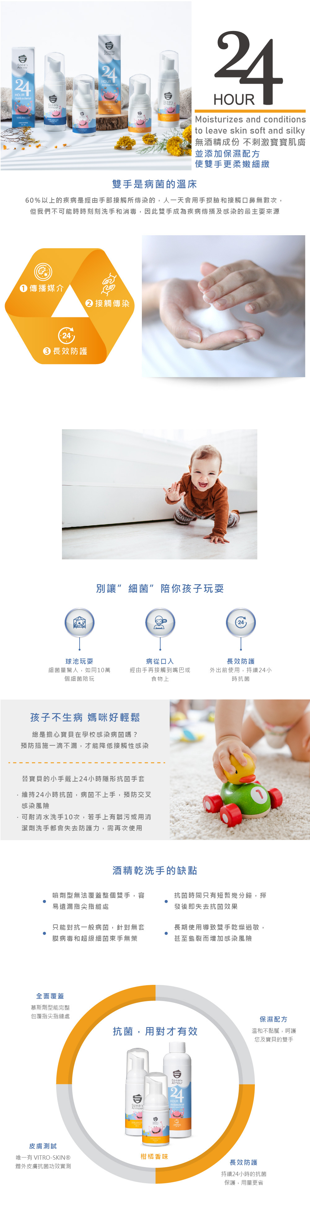 《 使用方法 》雙手洗淨擦乾後,輕壓適量乾洗手慕斯大人1下小孩半下,搓揉全手至乾,防護效果可長達24小時。