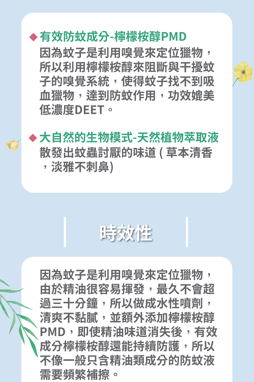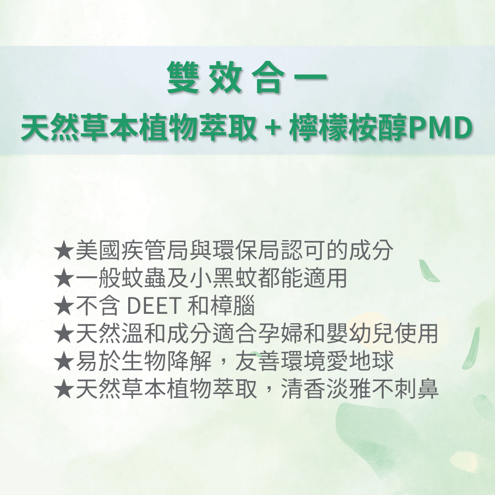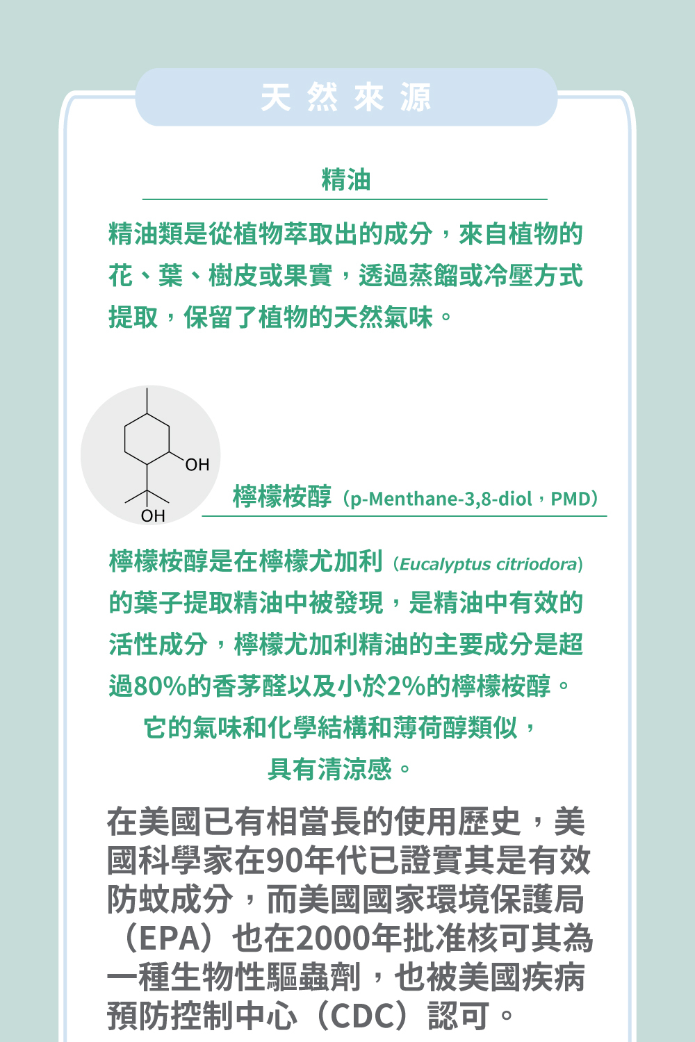 《 全 成 分 》香茅、丁香、茶樹、尤加利葉、芬多精、薄荷等植物萃取液、檸檬桉醇(PMD)