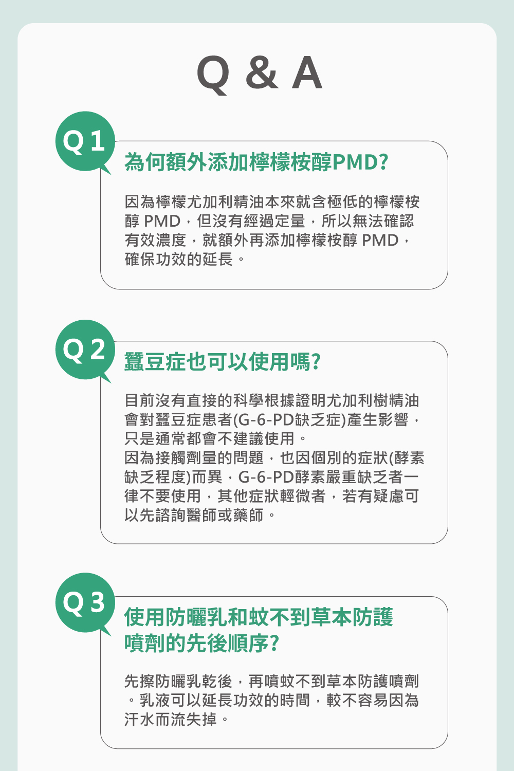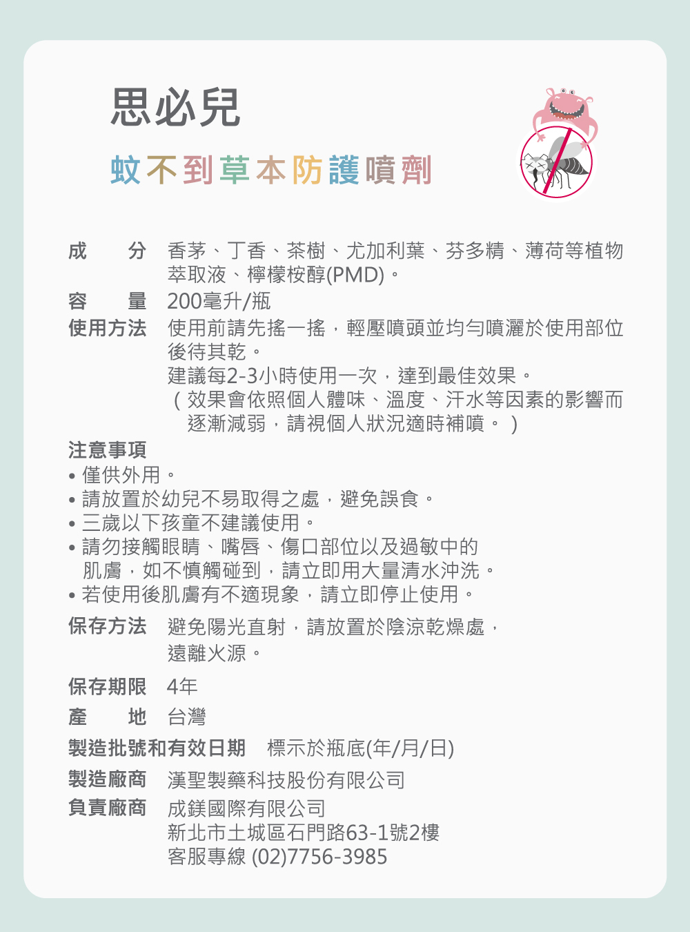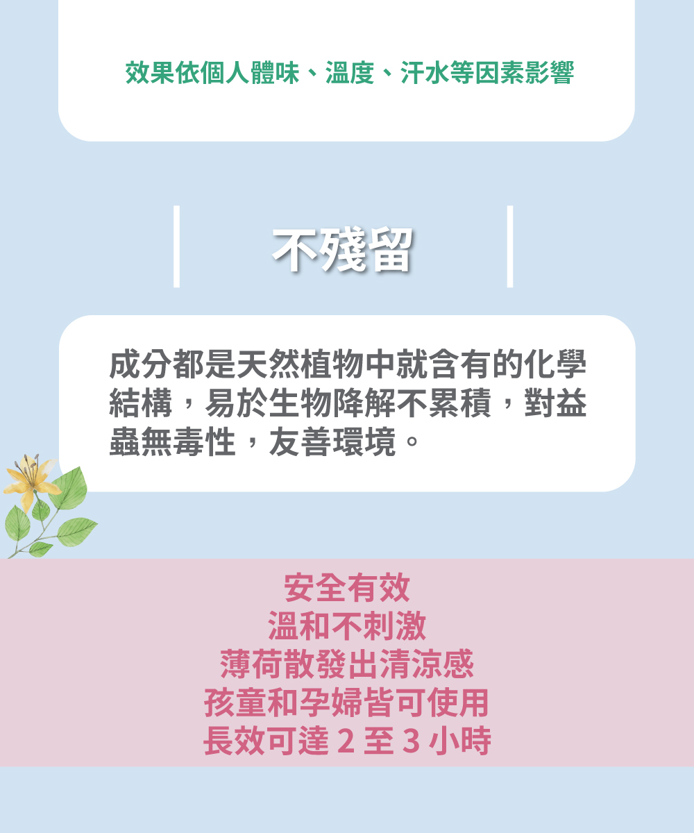 《 全 成 分 》香茅、丁香、茶樹、尤加利葉、芬多精、薄荷等植物萃取液、檸檬桉醇(PMD)